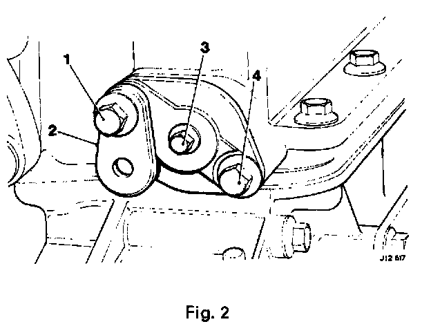 - Remove the tensioner housing securing bolt (4 Fig. 2) and withdraw the tensioner assembly.