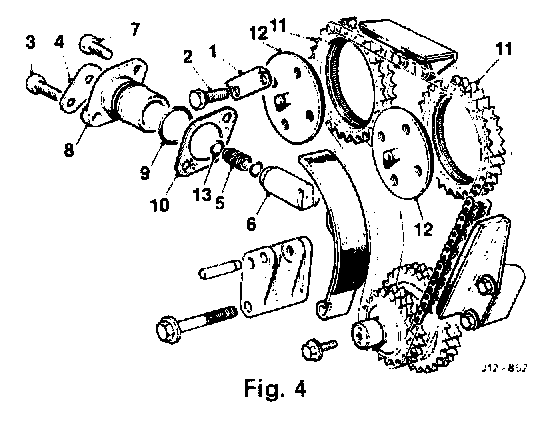 - Remove the camshaft coupling (12 Fig. 4) from the sprocket (11 Fig. 4) and align the securing bolt holes.