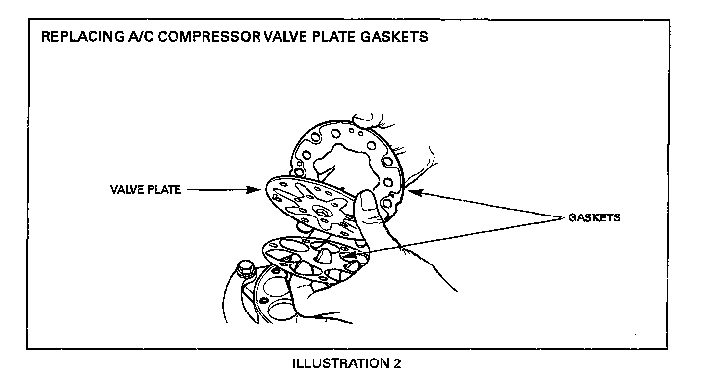 After determining the source of refrigerant leakage from the compressor, replace the shaft seal (repair operation number 82.10.11) and/or the compressor valve plate gaskets (repair operation number 82.10.26) as required.