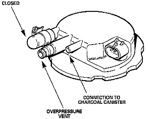The top of the fuel tank incorporates a removable evaporative flange with three outlets. One outlet is used for the filler neck vent hose on 1991 model year vehicles and is capped-off on later vehicles. The center outlet incorporates a 2.5-3.0 psi pressure relief valve and is connected to a relief tube that vents to under the vehicle. The third outlet incorporates a rollover valve and connects to the charcoal canister. Electrical connection to the fuel pump module is made through the evaporative flange.