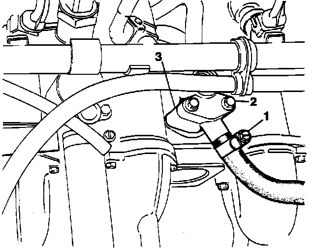 2. Loosen hose clamp (1) and disconnect breather hose from housing.