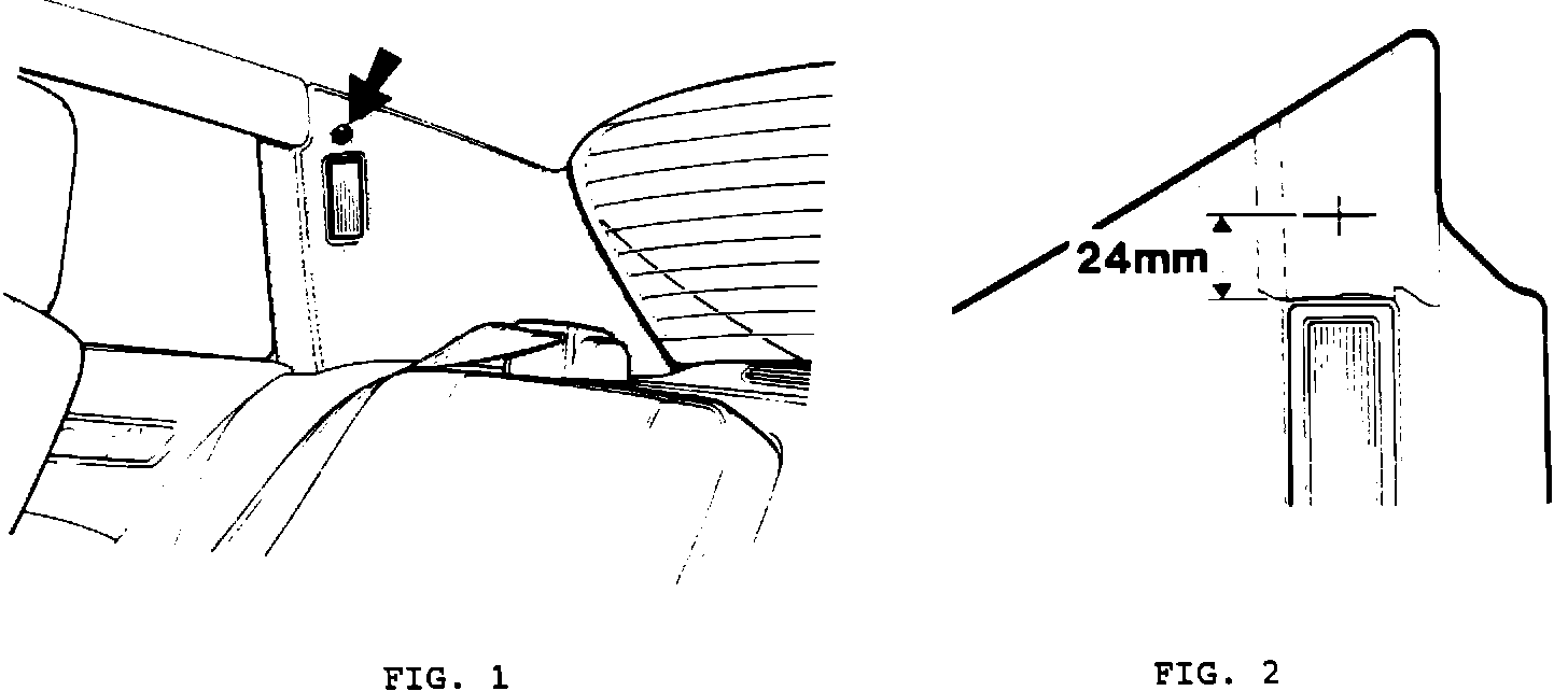^ Apply masking tape to the surface of the right and left hand side trim pads, as indicated in Fig. 2. Using a steel ruler and a pencil, mark out (on the tape) the location of the "push-in" button.