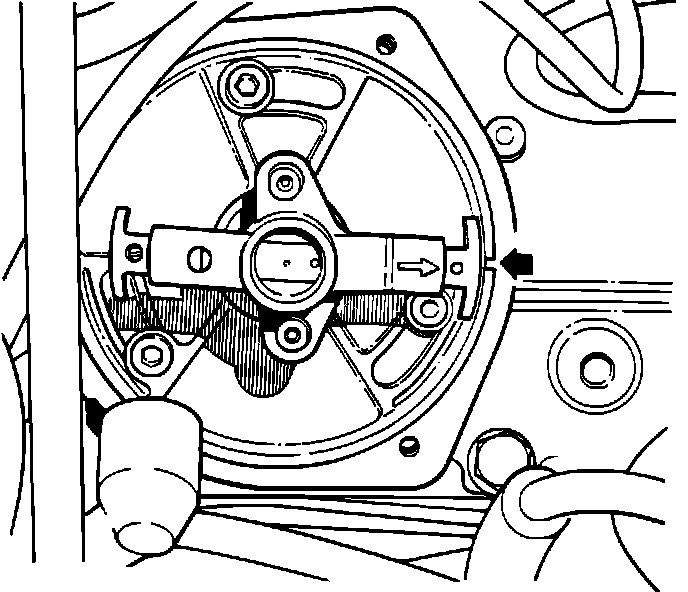 4. Rotate flywheel to TDC position on crankshaft pulley. This will align ignition rotor arm arrow with notch in distributor body and line on valley cover.