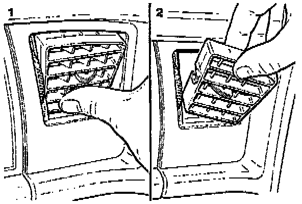 - Rotate the vent outlet downwards to its full extent (1) and apply pressure until retaining clips release. Remove the vent outlet (2).