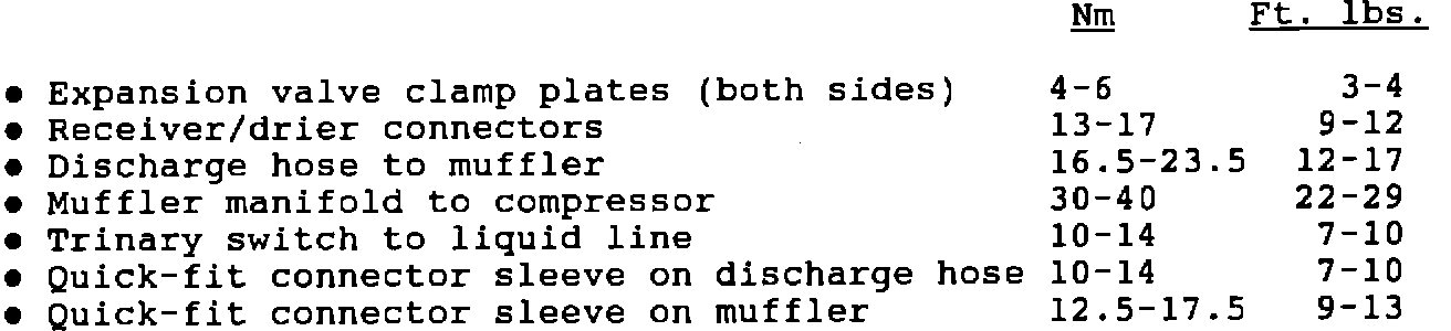 To ensure proper operation of the R134A A/C system, all system joints/connections must be torqued to specification. These specifications supersede the information in the Service Manual.