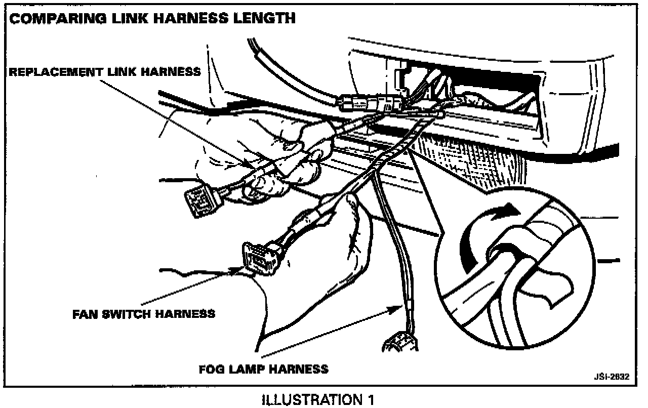 8. Carefully unwrap the harness tape (inset, Illustration 1) to expose the fan switch wiring and the fog lamp wiring.