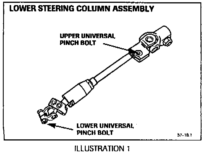 3. Remove the pinch bolt and nut clamping the upper steering column universal joint to the lower column (Illustration 1).