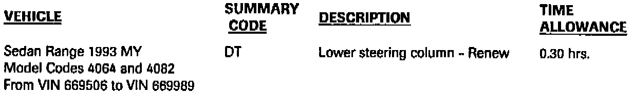 Examine all 1993 MY Sedan Range vehicles at the next service opportunity to see if they are part of this action. If the vehicle's VIN appears on the S398 SERVICE ACTION VIN LIST, a new lower steering column (P/N BEC 14009) must be installed.