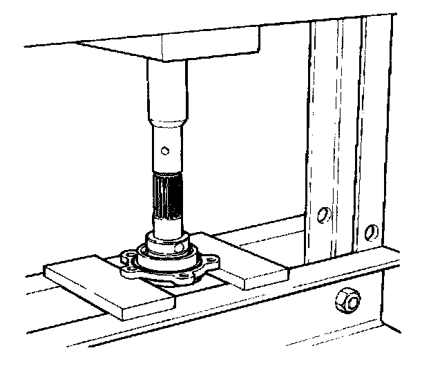 Remove the housing/tool assembly from the press and place tool JD 550-1 aside. Place the output shaft to the front and lubricate the seal. Fit and align the seal housing assembly to the output shaft. Place a new bearing to the front and lubricate the bearing. Align the bearing to the output shaft assembly. Position a suitable block of wood to press fit and align the output shaft assembly to the press / wooden block. Ensure that the flange securing studs do not rest on the press plate.