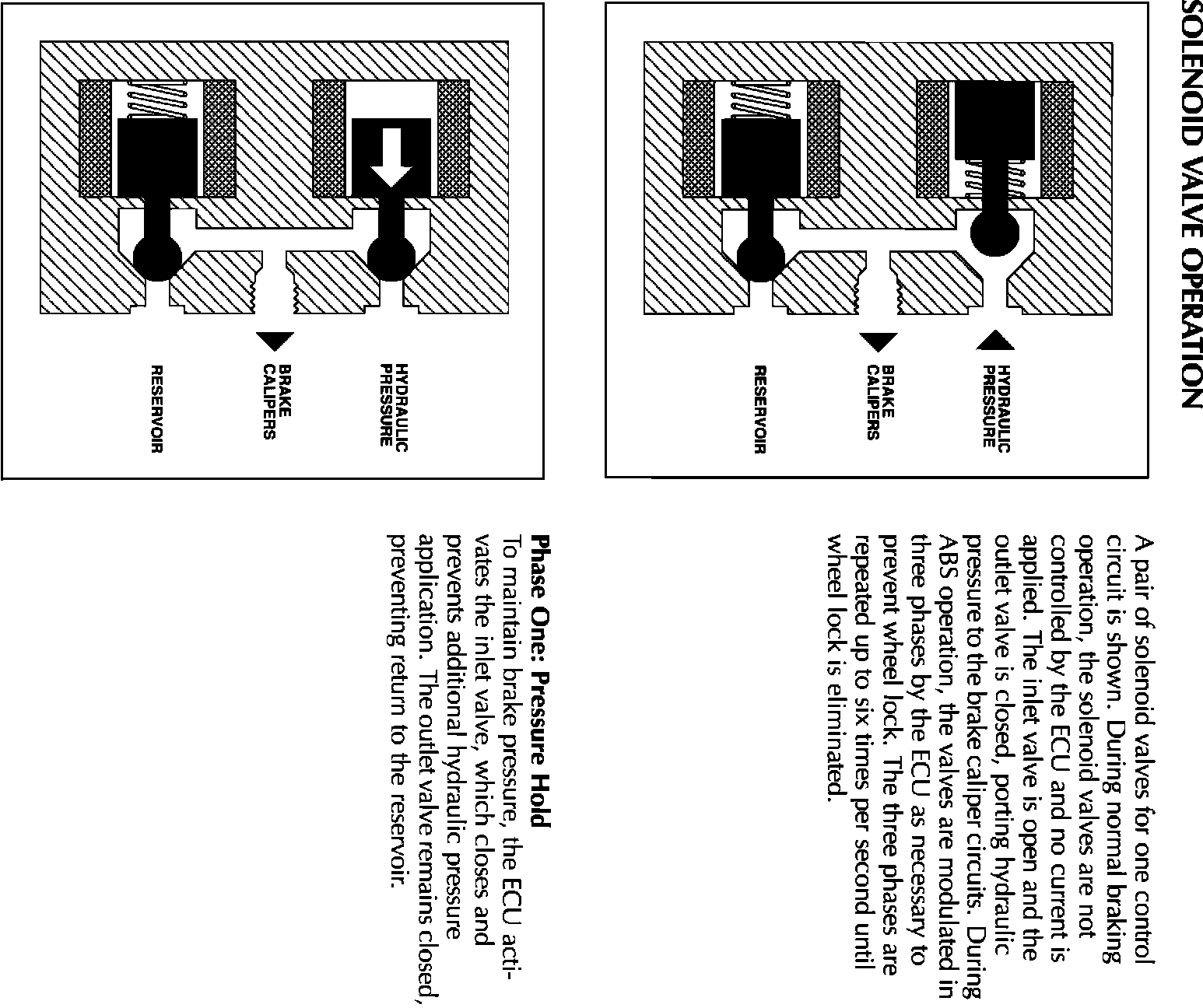 The six solenoid valves direct hydraulic pressure and hydraulic return in the three brake circuits during anti-lock conditions. During normal operation, the valves are at rest, allowing conventional application.