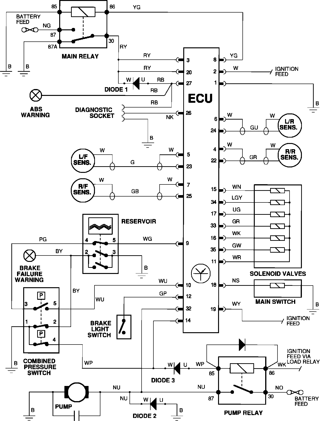 The ABS electrical circuit is protected by two 30-amp fuses, which receive direct battery feeds. The system is switched on by the ignition switch via the ECU.
