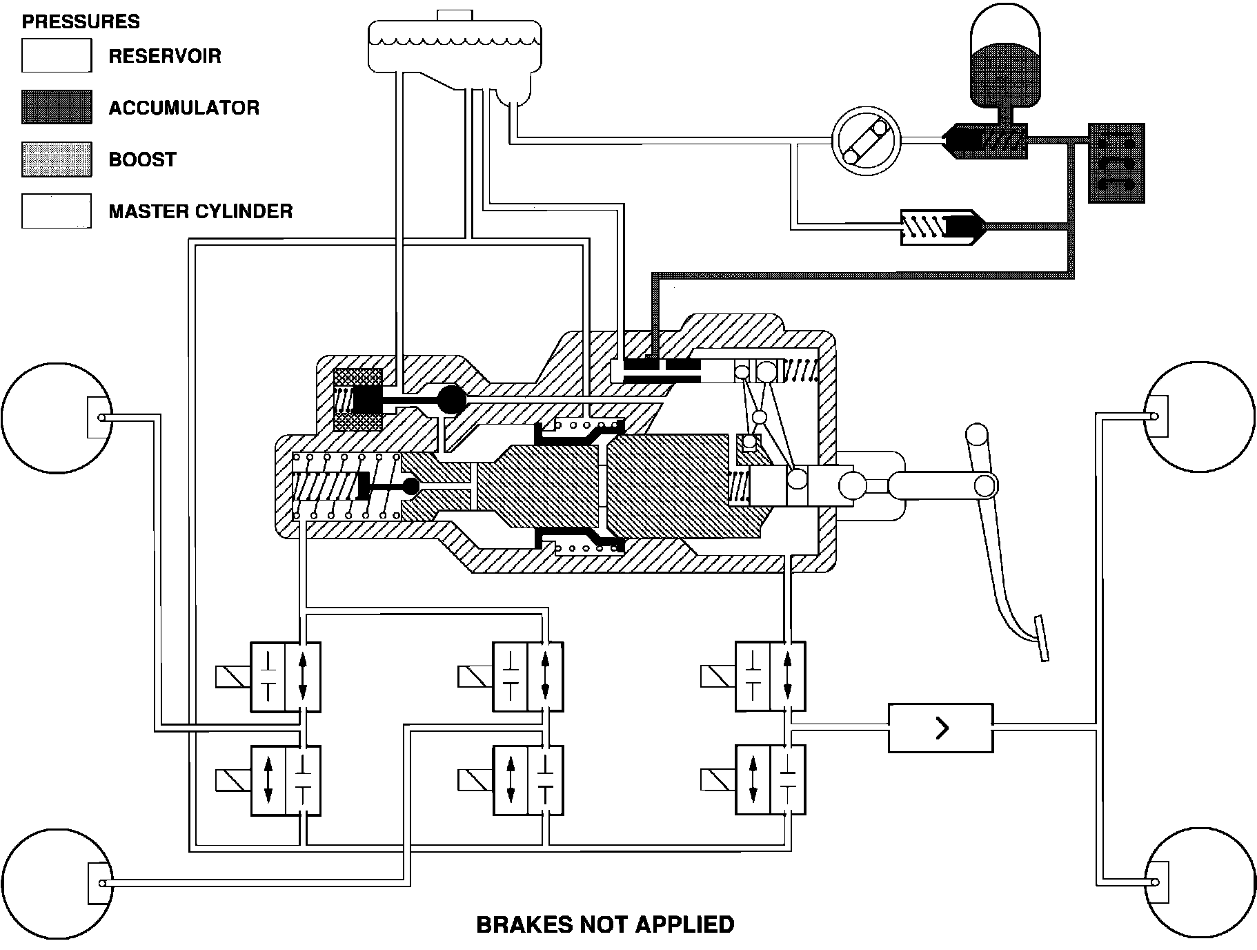 During normal operation, boost pressure is applied directly to the rear brake circuit, thus the description "dynamic." The front brake master cylinder is supplied with reservoir gravity pressure only, thus the description "static."