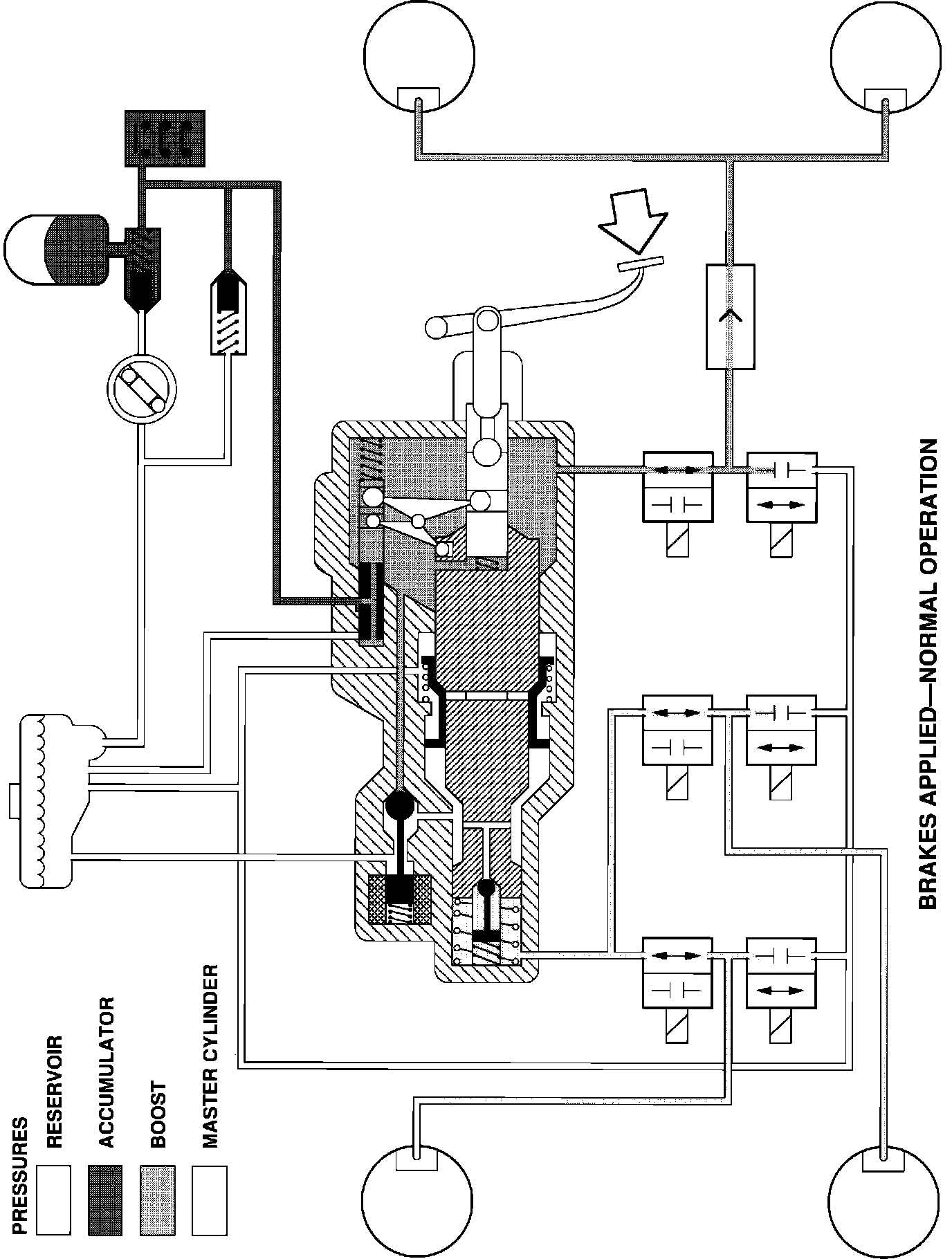 In the XJ-S system, three hydraulic circuits are used-one to each front wheel and one to the rear wheels. Depending on the mode of operation, the circuits operate differently: