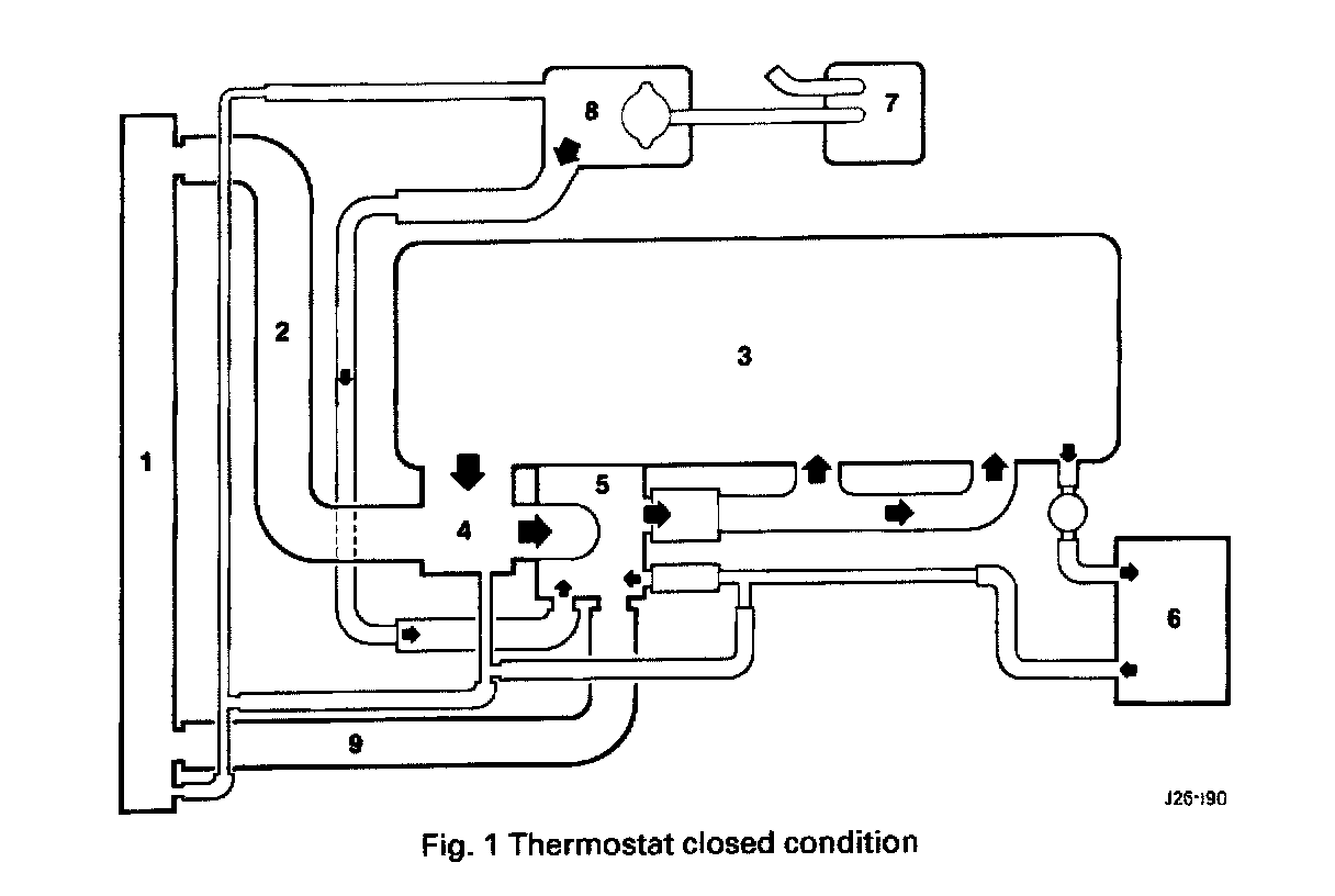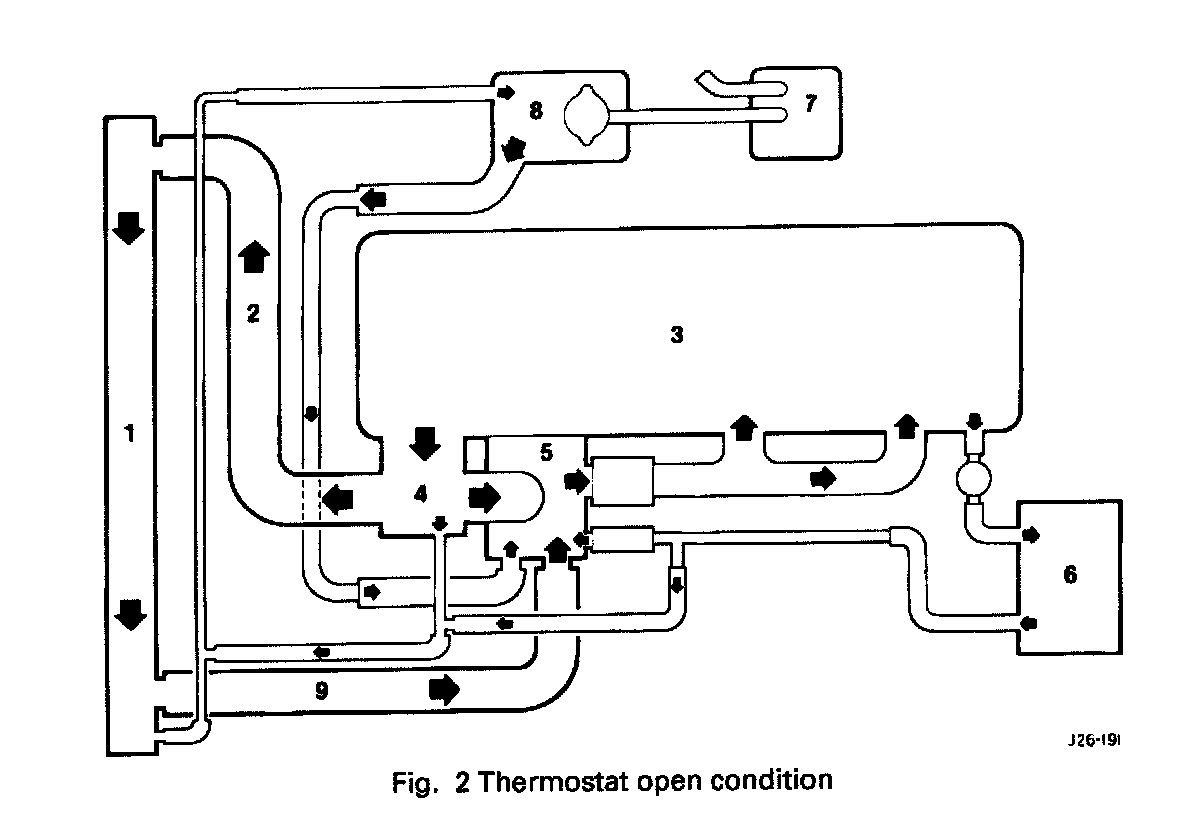 Under cold start conditions, coolant is forced by the water pump through the cylinder block and cylinder head to the thermostat housing. The valve is closed and coolant is therefore returned to the water pump suction inlet (Fig. 1). When the engine operating temperature is reached, the thermostat valve opens allowing coolant to flow around the system (Fig. 2).