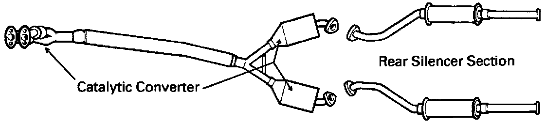 - Remove two nuts and bolts from the other flange type joint at the rear of the underfloor catalytic converters; loosen the third nut and bolt.