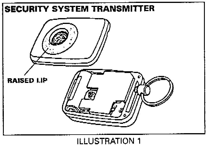 If customers require frequent security system transmitter battery replacement, inspect the front cover of the transmitter. If the transmitter cover does not have a raised "lip" (Illustration 1) around the button, replace the existing cover with the revised version.