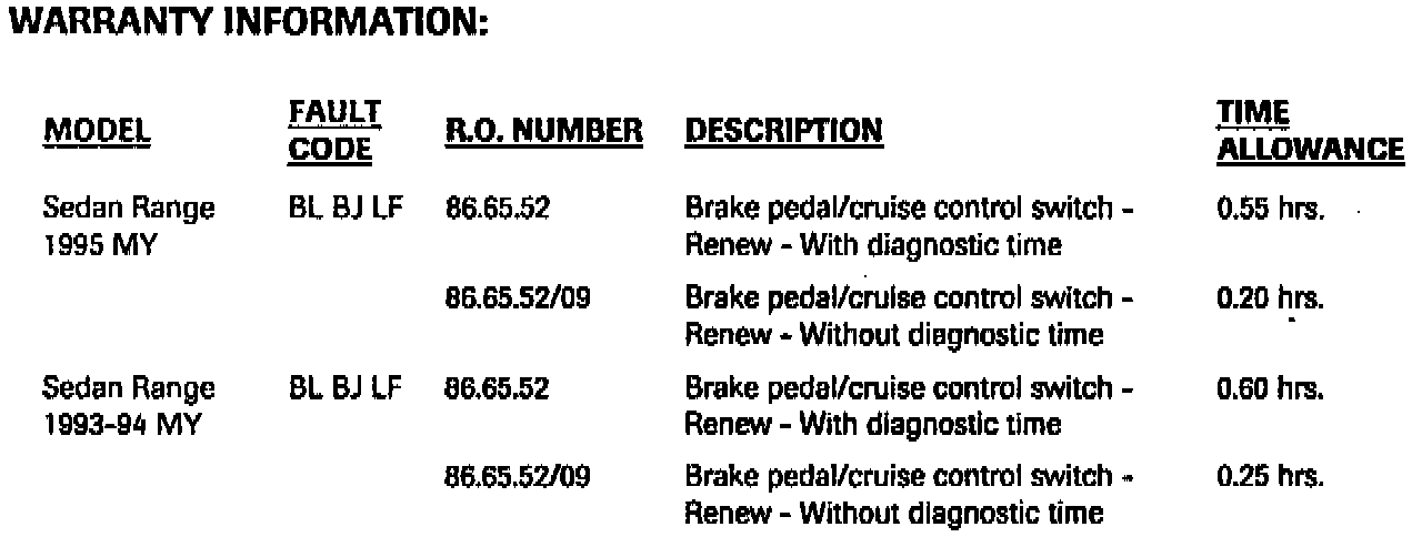 BRAKE PEDAL/CRUISE CONTROL SWITCH REPLACEMENT PROCEDURE