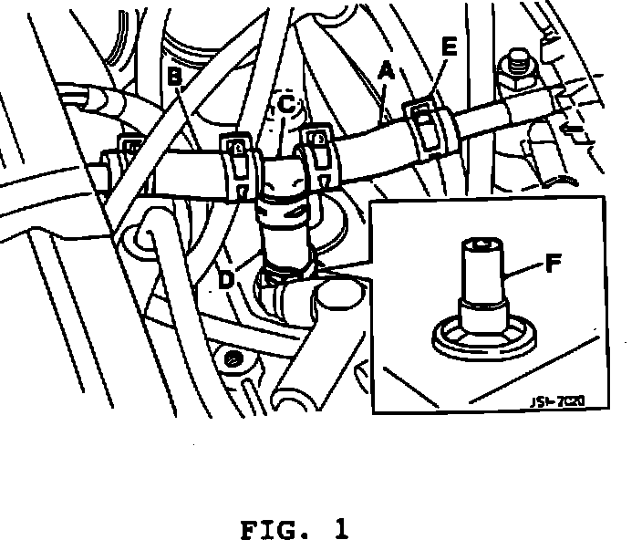 12. Slide a clip on to the upper end of each part load breather pipe. (The clips remain loose until later). Install the "T" piece unit (previously sub-assembled in step 10) to the front stub pipe of the oil separator (Fig. 1 F), simultaneously engaging the part load breather pipes into the purge hoses, forming the side legs of the "T". Position the loose clips in their correct locations (Fig. 1 E). Position the clip (Fig. 1 D) to retain the "T" to the oil separator stub.