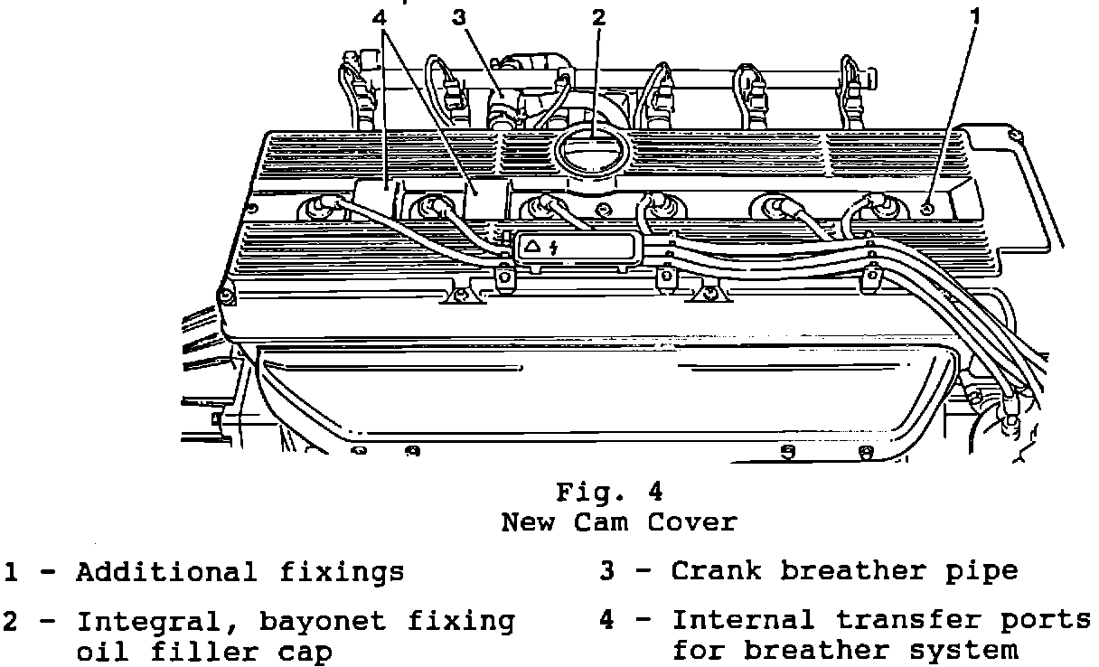 The all new black finish cam cover is retained by 13 fixings and incorporates the oil filler cap and crankcase breather system (Fig. 4).