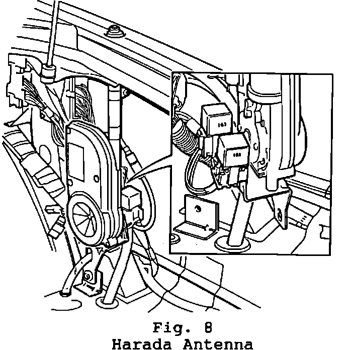 The Harada antenna has improved reliability and incorporates the timer unit simplifying the system's circuitry. Figure 8 shows the motor unit installed. The inset figure has the unit rotated 180 deg. to show the fuel pump relays located on the mounting bracket behind the antenna.