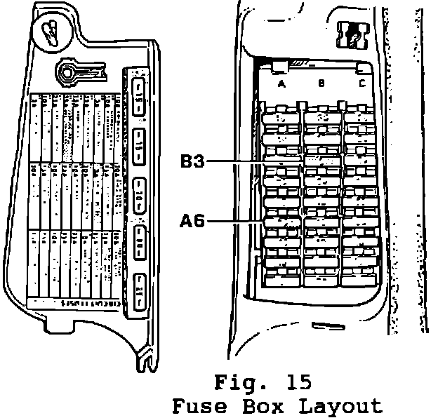 The fuses for these connectors are located in the RH fuse box (Fig. 15), the ratings and fuse numbers are as follows:
