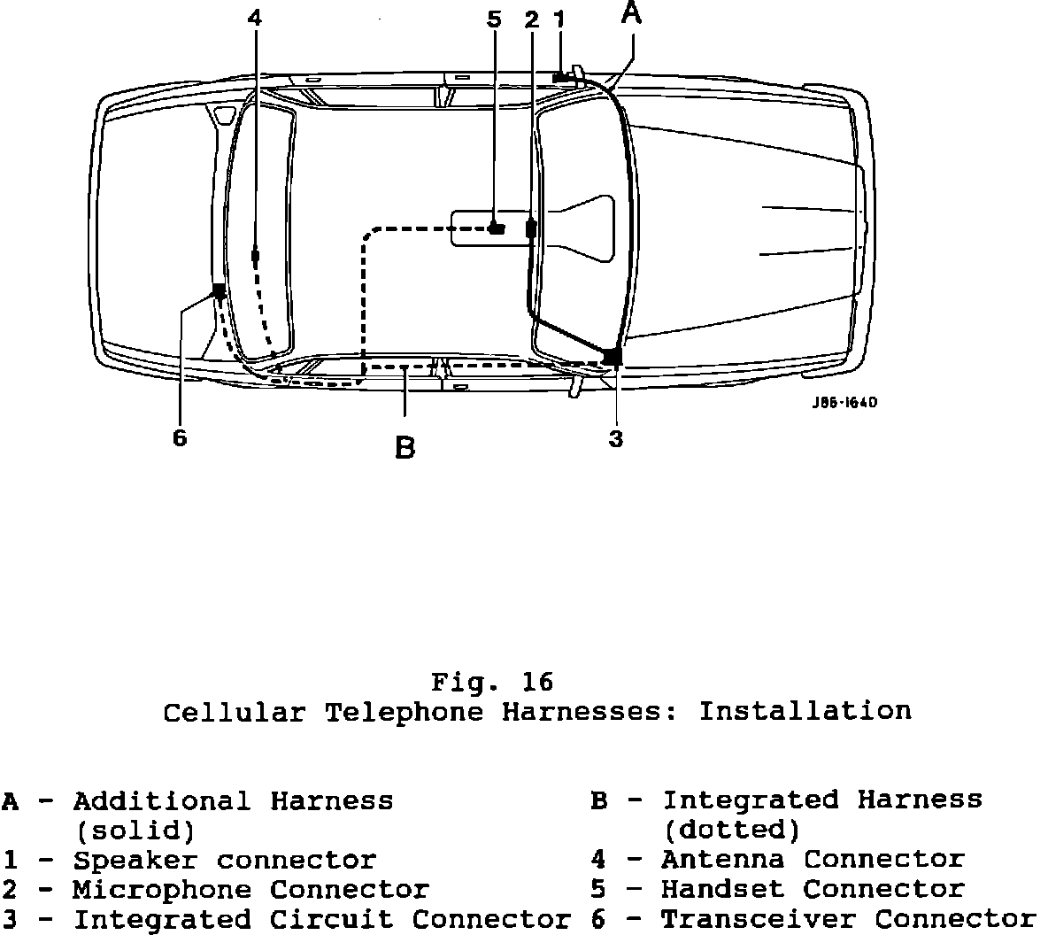 The vehicle is pre-wired for a Motorola cellular telephone. Two harnesses are used. The transceiver/antenna harness is integrated into the RH side harness. The speaker/microphone harness is separate and routed across the bulkhead. (Fig. 16)