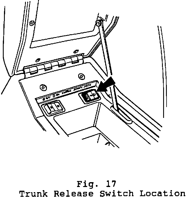 The remote trunk release switch has been relocated to the rear edge of the center armrest cubby box (Fig. 17) next to the security system control switch.