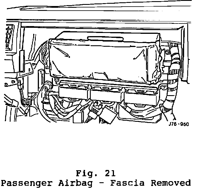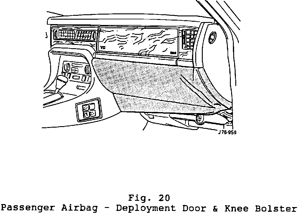 A passenger side airbag with mechanical sensing is standard for 1994 MY. It meets the requirements of Federal Motor Vehicle Safety Standard (FMVSS) 208, optimized for protection of an unbelted occupant. The unit is mounted in place of the fascia glove box. The deployment door is faced with veneer to match the fascia. The knee bolster is an integral part of the restraint system (Fig. 20).