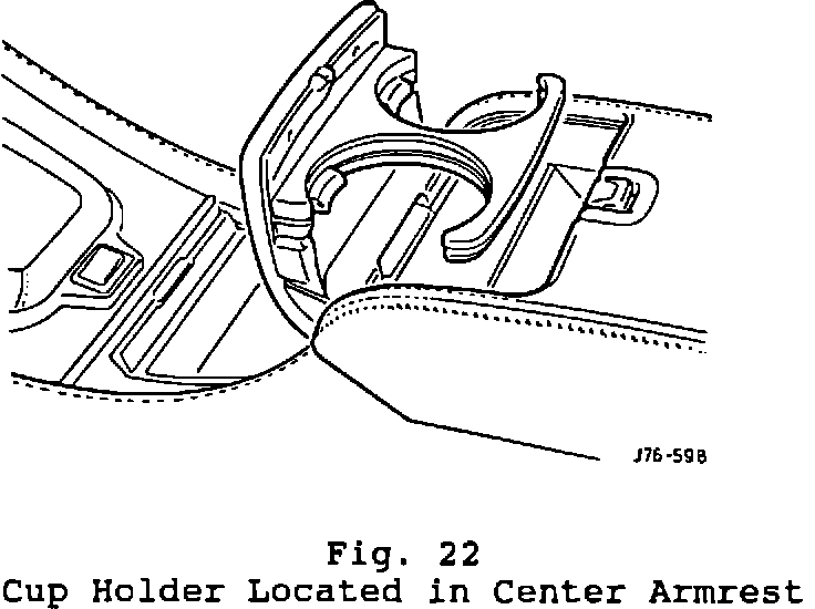 A cup holder is incorporated within the front end of the center armrest. The cup holder pops up into place on when the release button is pressed (Fig. 22).
