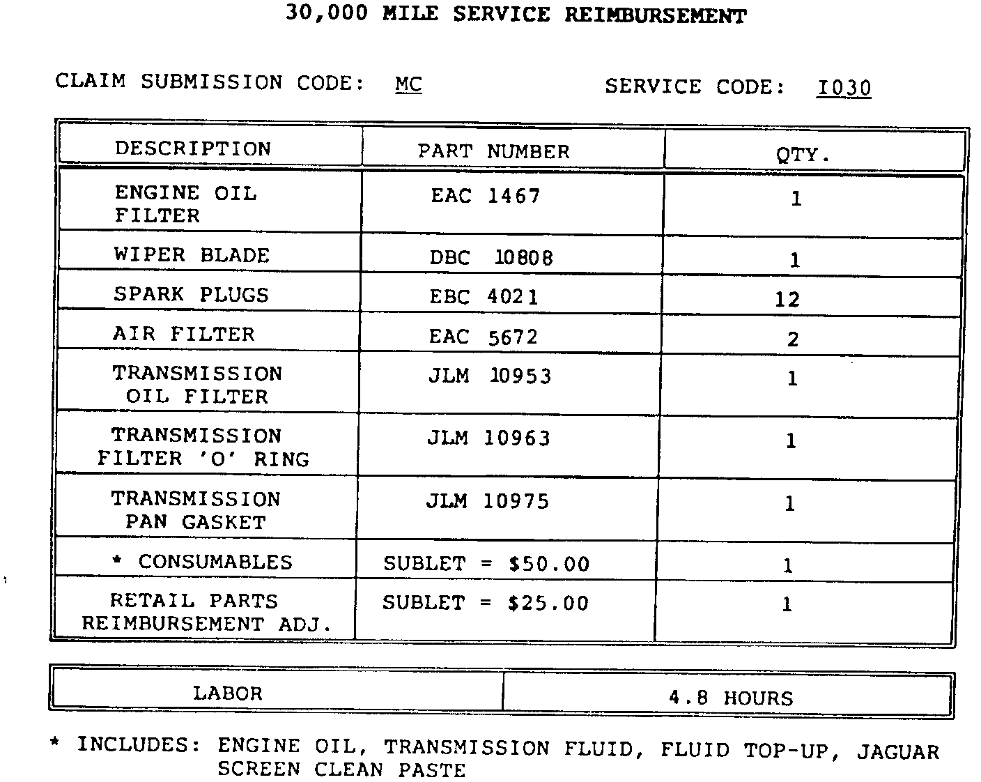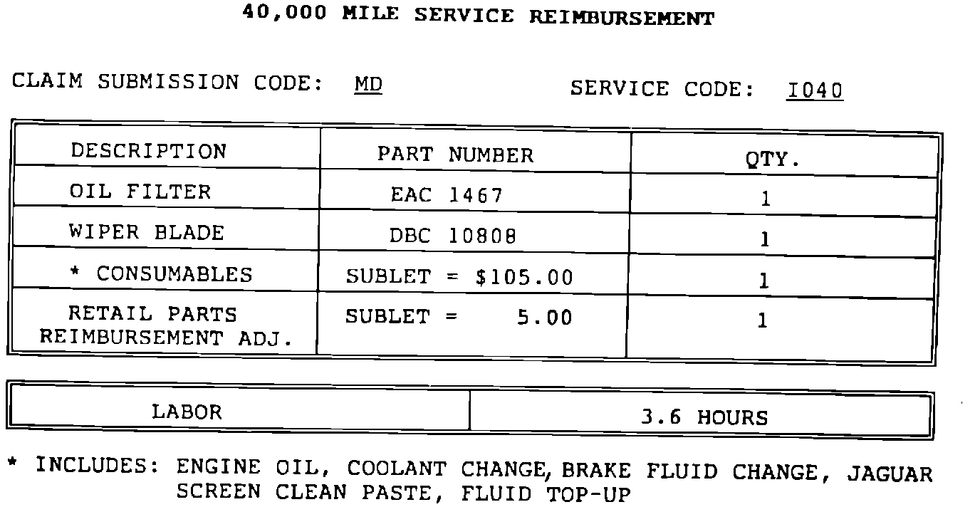 Parts will be reimbursed at Jaguar Cars Inc. suggested retail price. When the maintenance claim is submitted, parts will be priced at dealer cost plus 40% handling, a sublet amount will then be added to increase reimbursement to suggested retail. For each service, a sublet allowance will be paid for consumables such as oils and fluids. This allowance also covers waste disposal.