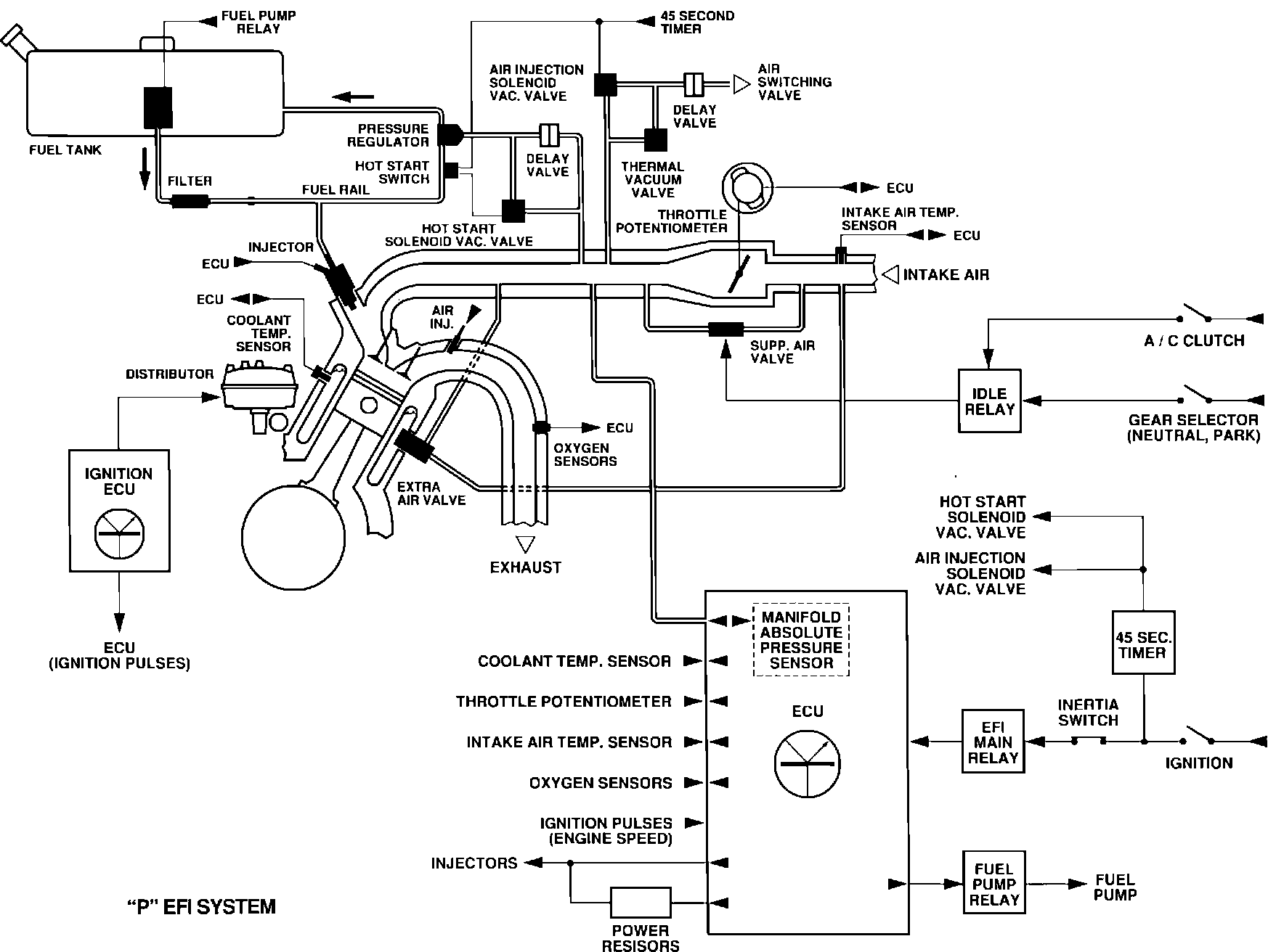 The "P" type electronic fuel injection system is an indirect injection system which incorporates solenoid operated low pressure injectors intermittently spraying fuel into the inlet port of each cylinder. A digital engine control module (ECM) with an integral manifold pressure sensor, governs the amount of fuel injected by controlling the duration of injection. The manifold pressure and speed signal, derived from ignition pulses, provide the main control for the fuel injection. Additional sensors are used to monitor engine temperature, inlet air temperature and throttle position, etc, thereby ensuring optimum fueling for all engine operating conditions.