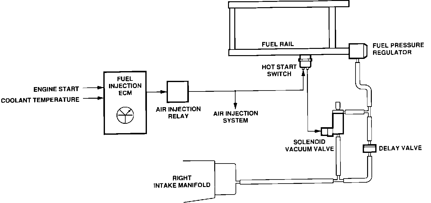 This system is controlled by EFI ECM. Power is derived from air injection relay. When air injection is enabled, (after all engine starts), current is applied to hot start switch. When fuel rail temperature is 158° F (70° C) or higher, switch closes and activates solenoid vacuum valve. This directs vacuum through delay valve to fuel pressure regulator. This momentary delay in vacuum increases fuel pressure to purge fuel rail.