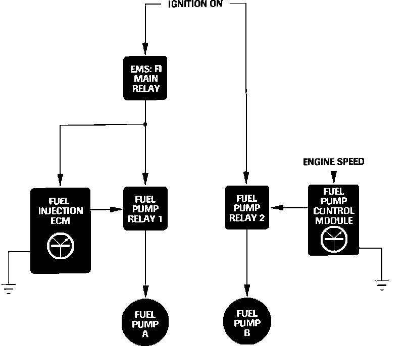 The 6.0 liter engine now uses two fuel pump modules to meet fuel requirements. Modules are identical but operate independently in two stages. One pump (A) operates continuously while engine is running. The second pump (B) is activated when engine speed exceeds 2840 rpm. Each pump is operated by a separate relay. Pump relay 1 is switched by EFI ECM; relay 2 by fuel pump control module. Fuel pump control module receives an engine speed input from Ignition ECM and switches relay 2 coil to ground when engine speed reaches 2840 rpm. When engine speed drops below 2000 rpm, ground is interrupted.