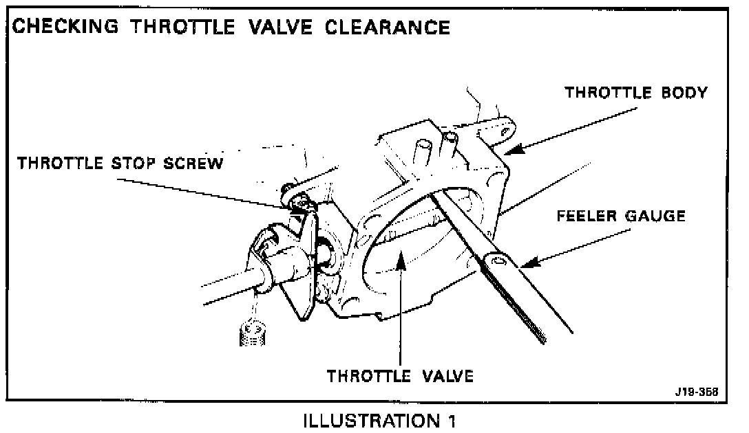 Throttle valve checking clearance: 0.001 - 0.003 inch (0.025 - 0.076 mm) Check the clearance at the bottom as well as at the top of the throttle valve. If a significant difference is found between the top and bottom measurements, the throttle valve may be offset on its shaft. If both measurements are within the above range, do NOT adjust the throttle stop screw (Illustration 1).