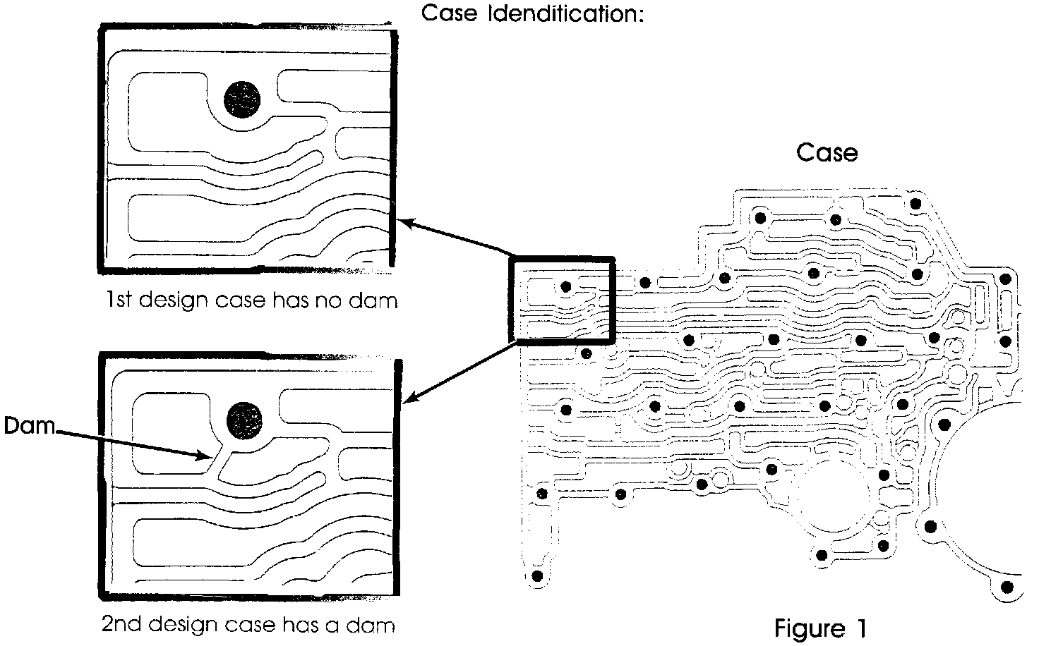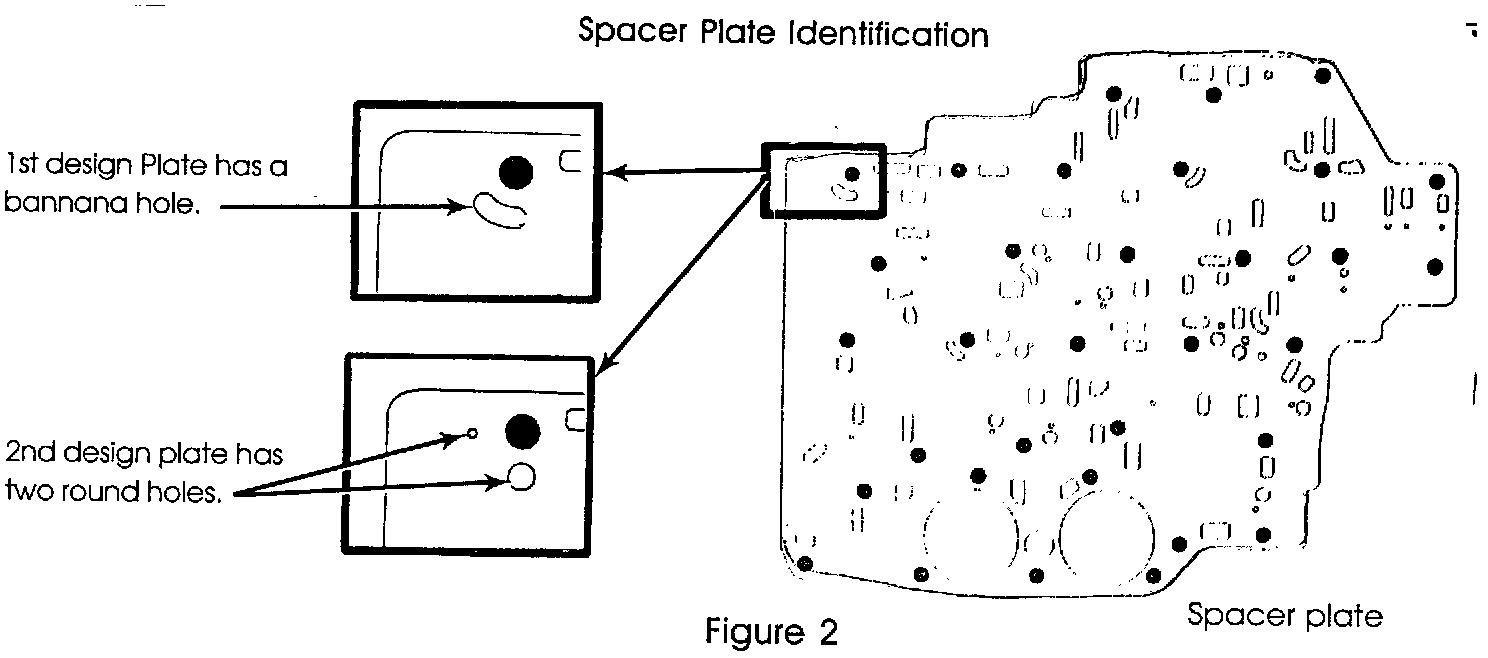 It is also necessary to verify that the force motor is not sticking (Figure 5), and that the valve body is checked for a broken screen (Figure 5). A missing cup plug in the accumulator housing (Figure 5) can also create no line rise. Be sure to check all of these areas whenever you are looking for the cause of any high/low pressure complaints. Figure 1 - Case Identification