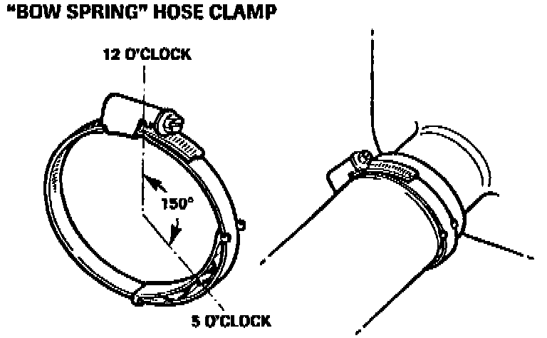 When fitting "bow spring" hose clamps, the center of the "bow spring" must be at a 5 o'clock (150 0 angle) position relative to the center of the screw housing as shown in Illustration 1.