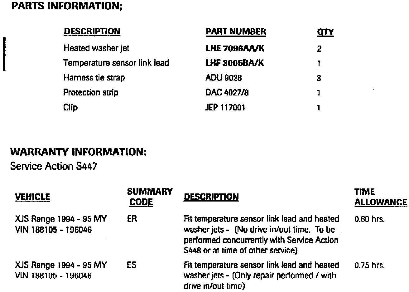 At the next service opportunity on all 1994 - 1995 MY XJS vehicles from VIN 188105 - 196046, perform the service action as described below.