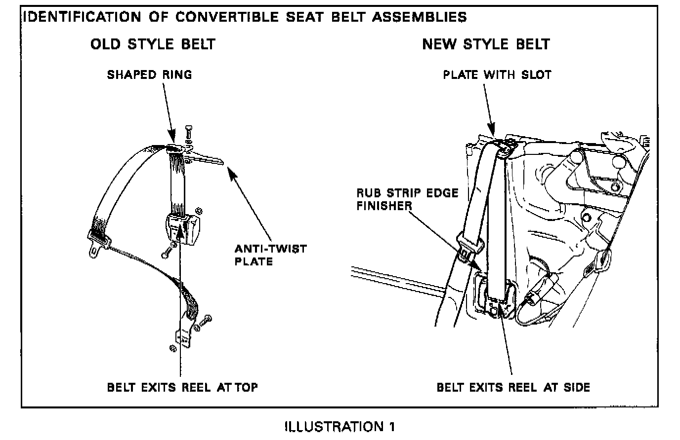 In case of a customer complaint of seat belt twisting, install the seat belt guide as described on the next page. To determine whether the longer seat belt assembly is already installed in the vehicle, check for the differences shown in Illustration 1. If the longer seat belt assemblies also need to be installed, refer to bulletin 76-110 Amended 3/96 for the installation procedure.