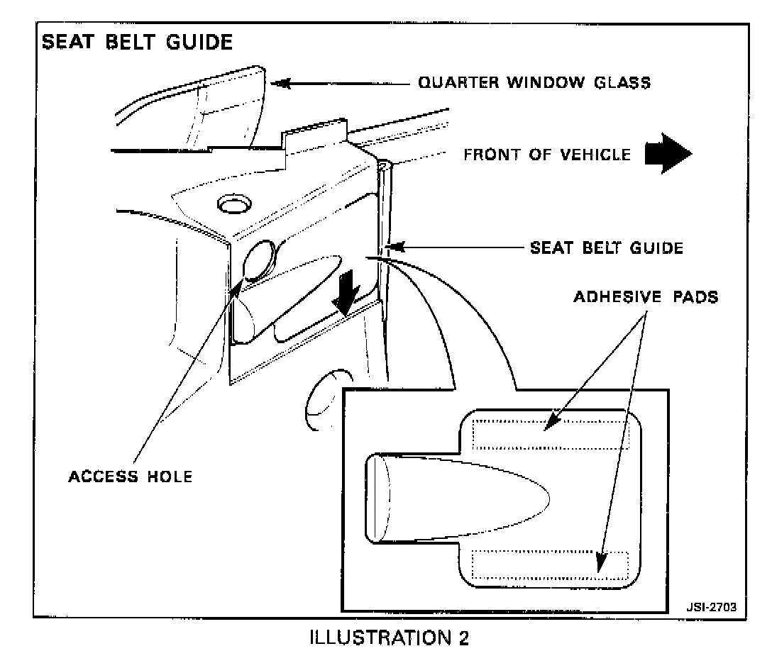 9. Remove the backing tape from the adhesive pad. Hold the seat belt to one side, align the guide with the access hole in the post (Illustration 2), and press the guide firmly into position.