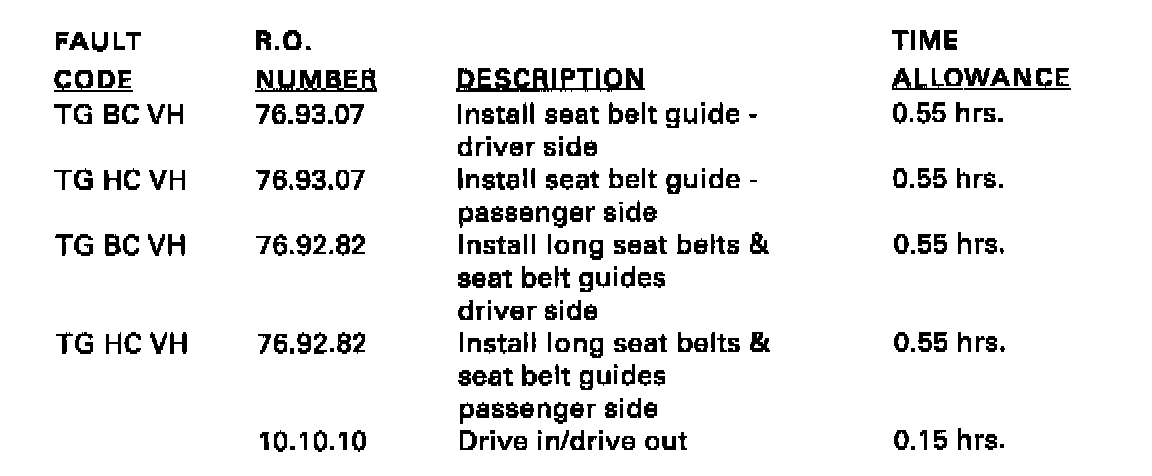 Technical Bulletin 76-110 described the installation of revised seat belt assemblies in case of customer complaints of belt shortness and/or twisting of the original seat belts. The longer belt was installed in production starting with VIN 198712. Starting with VIN 224736, a seat belt guide is also installed at the top of the B post, to further resist any tendency of the belt to twist.