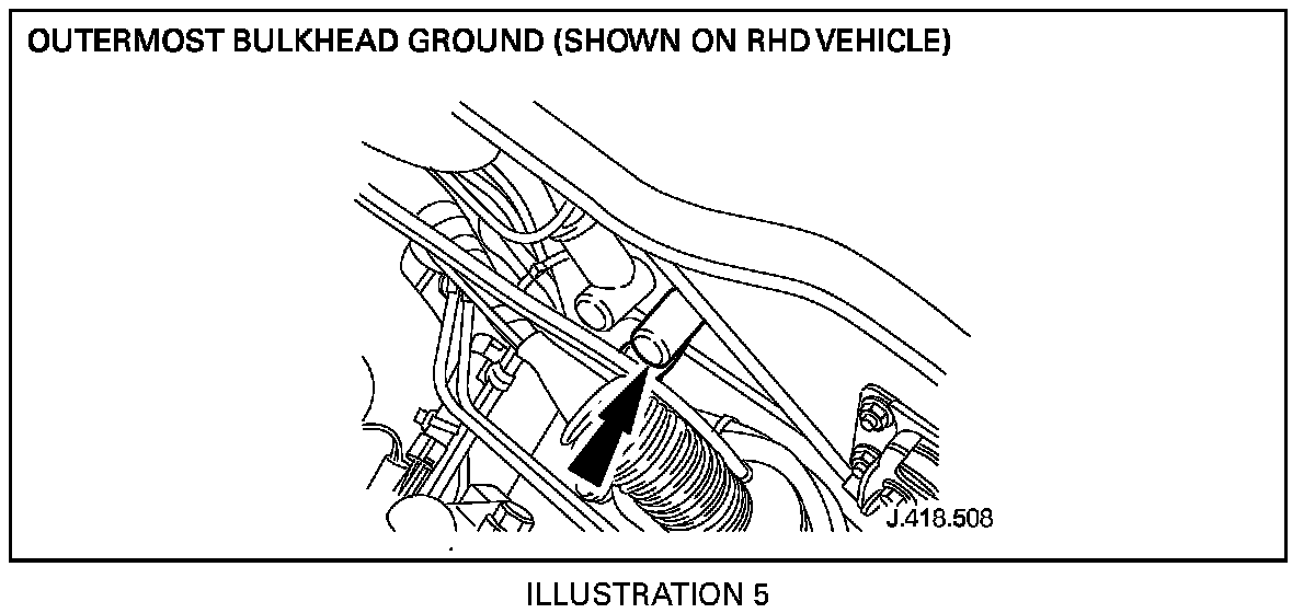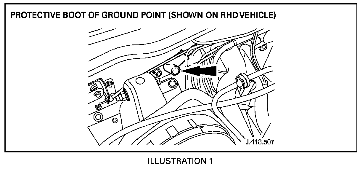 5. Working on right side of engine compartment, move aside innermost ground point protective rubber boot (Illustration 1).