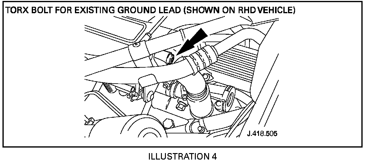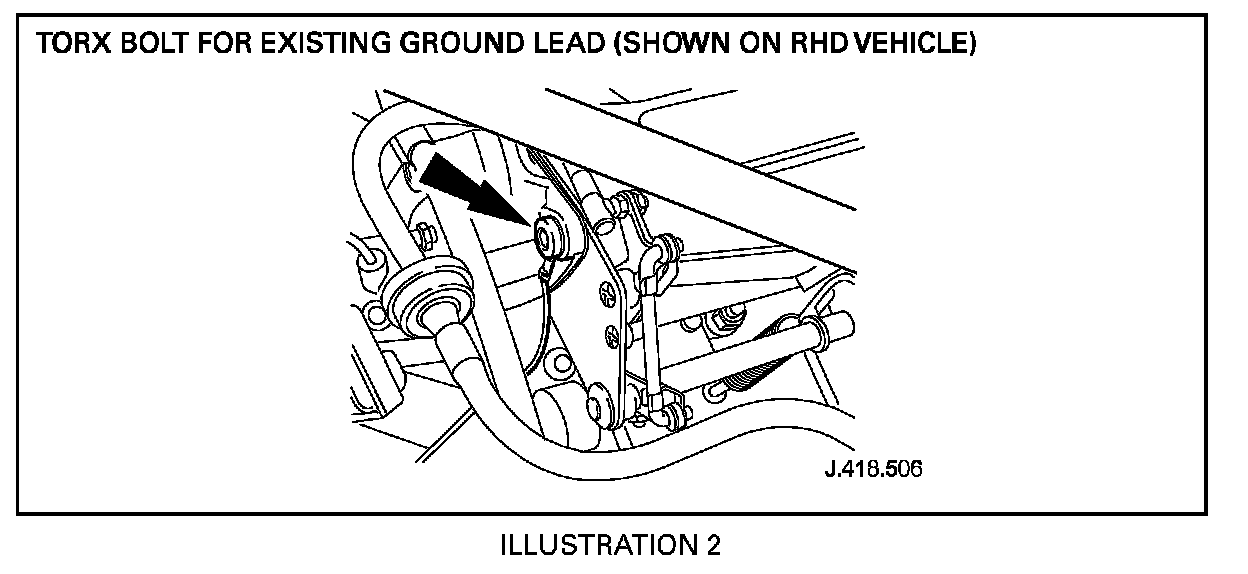 14. Remove the Torx mounting bolt from the existing ground lead on the rear of the right side intake manifold (Illustration 2).