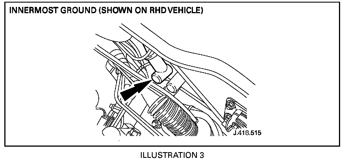 19. Working on left side of the engine compartment, move aside the protective rubber boot of the innermost ground point (Illustration 3).