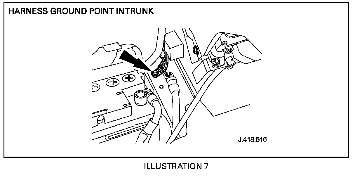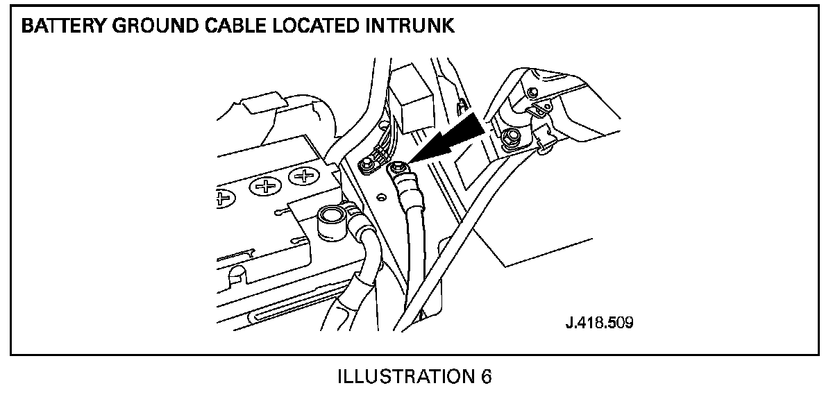 38. Remove mounting bolt securing the battery ground cable to the body (Illustration 6).