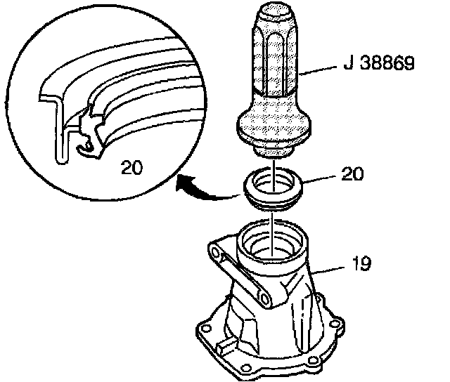 1. Install the prop shaft front slip yoke seal (20) with the J 38869 or J 38694 for fixed yoke applications. Apply J 36850 or equivalent to the spring pocket of the seal.