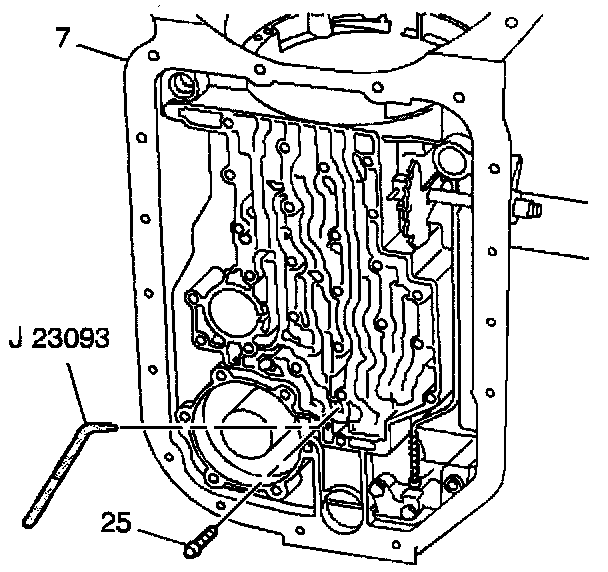 1. Locate J 23093 into the center support direct clutch passage through the hole in the case.