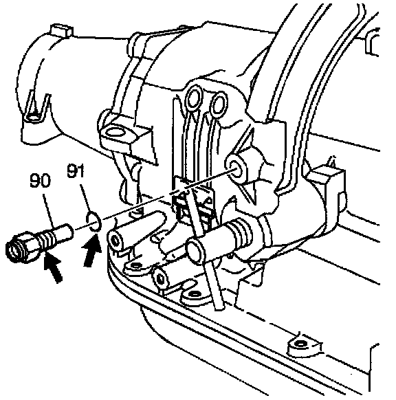 5. Install the oil cooler pipe fitting (90) into the transmission case.
