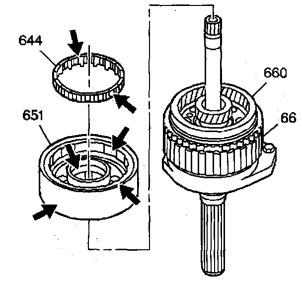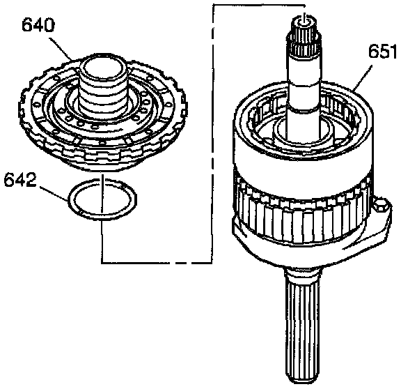 6. Remove the roller clutch assembly (644) from the reaction drum and carrier assembly (651).