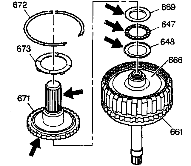 20. Remove the thrust bearing (647, 648, 669) and the thrust bearing races from the rear internal ring gear (666). The thrust bearing may be stuck to the output shaft (671).