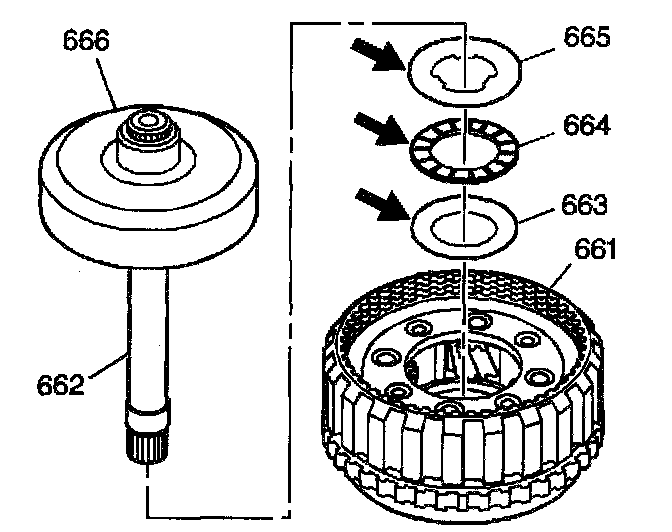 22. Remove the rear internal gear (666) and the main shaft (662) from the output carrier assembly (661).